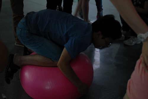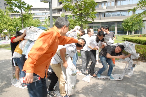 上午11点整,工作人员即展开了紧张而有序的会场布置工作。本次运动会共分为三块。第一部分为师生拔河比赛,参赛一方为学院老师组成的“全明星阵容”,而另一支队伍则由一群充满活力、昂扬斗志的学生组成。第二部分为集体项目,由5支来自不同党支部的师生共同组成的队伍同台竞技,集体项目包括“压吗”、“履带收获车”及“跳大绳”三大部分,根据三个项目总积分评定最终成绩。第三部分为更加诱人的个人项目,包括“踩石过河”、“坚持就是胜利”、“乒乓球九宫格”、“踢毽子->呼啦圈->双人跳绳”及“折返袋鼠跳”等,项目以游园会形式开展,广大师生可以现场报名。