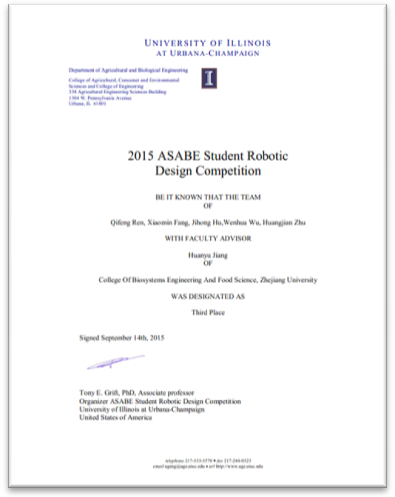 受浙江大学教育基金会浙农信国际交流基金的资助和学院的选拔,生物系统工程2012级胡季宏、吴文华、高源、冯焯、曾昱深等同学参加了7月24日至31日在美国路易斯安那州新奥尔良市举行的美国农业与生物工程师协会(ASABE)第九届国际大学生机器人设计竞赛。