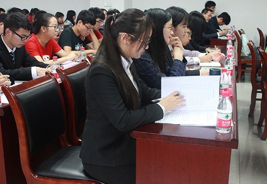 五分钟的休息过后,主持人宣布正式会议开始。一曲高昂的国歌后,学院党委副书记陈素珊老师为大会致开幕词。陈老师重申了我校校风、学校精神及学生会管理的八字方针等内容,并以平实的语言和贴近生活的事例表达了对青年学子能担大德的期待。陈老师特别指出,社会对于人才的认定总是以“德”为先,强调核心价值观乃一种大德,语重心长地对青年学子的公益情怀抱有期望。陈老师提到,为了担起历史重任,书写无愧时代的壮丽篇章,同学们应当不断努力。陈老师的一席话直指同学们的内心,赢得了热烈的掌声。