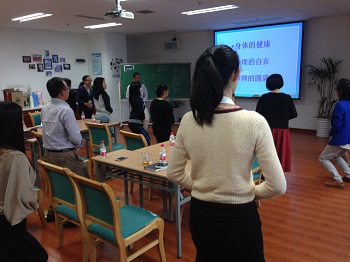 老师们相互交流,提出自己的困惑和体会,何老师都耐心地为大家解答,并旁征博引,普及了《道德经》和《黄帝内径》中的知识,并教老师们一些实用的减压动作和保健常识。过称中,有些老师还积极地做记录,这些情景让我感触很深,也看到了老师们可爱和充满活力的一面。培训结束后,部分老师还私下和何老师交流自己遇到的一些问题。通过这次活动,也深深地体会到学院对教职工,对学生浓浓的人文关怀。