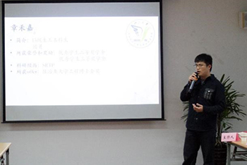 最后登场的是13级生工章禾嘉学长。他目前已获佐治亚大学工程博士全奖offer,学长为大家分享了自己的经历,并且强调了各项基本要求的重要性,指出要尽量的利用身边的资源。