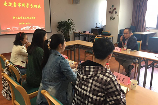 浙江大学120周年校庆和生工食品学院60周年院庆即将到来之际,06届本科毕业生费军伟校友于4月13日受邀返校座谈,与在校学生交流求学经历和职场感悟。座谈会由本科生辅导员张云飞主持,参与交流的学生代表有王蕾、顾頔、黄立夏、方媛媛、张欢欢等同学。