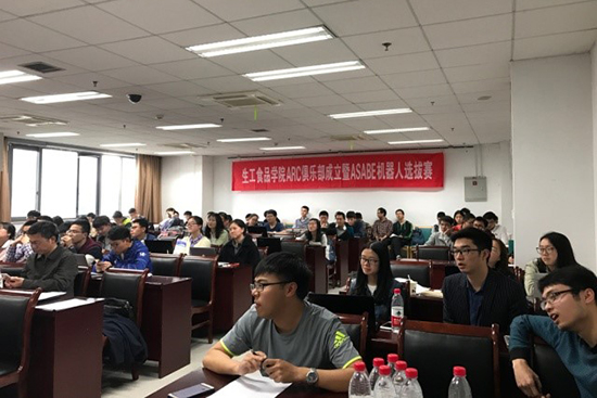 ARC机器人俱乐部成立仪式后,2017年ASABE(美国农业与生物工程师学会,是农业工程学科最权威的国际学术组织。)机器人竞赛选拔汇报开始举行。此次共有15个小组参加,每个小组分别介绍了各自精彩的设计方案,各有千秋的方案引起了在座老师和同学们的注意。有的小组对机器的设计进行了形象生动的动画演示,更有优秀的小组进行了实物视频的展示。在各个小组展示之后,往届参赛代表和老师对其进行提问并给予指导建议。同学们的汇报内容涉及路径规划、图像识别、执行机构控制以及系统设计等多个方面,每个方案都是同学们的精心构思,不同方案之间的交流更是产生了新的思维碰撞。