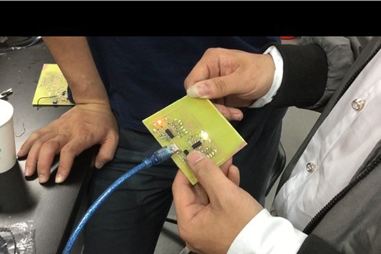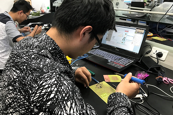 当构思完成后,同学们就用所学的电路软件绘制了原理图,再进行彩灯的电路板设计,这一步需要紧紧围绕创意。然后在实验室进行电路板腐蚀,把不需要的部分除去,最后进行元器件的焊接以及作品调试。