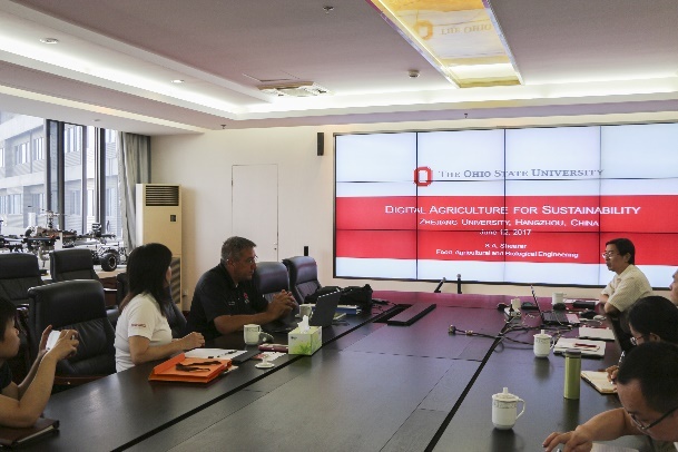 Scott Shearer教授、Yuanhui Zhang教授、Jiyoung Lee 副教授、Karen Mancl教授、Xinlei Wang教授、Lingying Zhao教授分别作了《Digital Agricultural for Sustainability数字农业可持续发展》、《An Environment-Enhancing Energy Paradigm --Hydrothermal Processing of Biowaste and Algae into Biofuels with Nutrient Reuse, Wastewater Treatment and Carbon Capture利用藻类生物燃料的营养再利用、污水处理和碳捕获等能源范例来优化环境》、《Microbes, Environments and Human Health微生物、环境和人体健康》、《Treatment of Food Processing Wastewater食品加工废水处理》、《Sustainable Environmental Management in the U.S. Livestock Industry美国畜牧业的可持续环境管理》、《Measurement, Modeling, and Mitigation of Air Pollutant Emissions from Agricultural Animal Feeding Operations畜牧养殖过程中空气污染物的检测、模拟与减排》的学术报告。学院院长朱松明教授及何勇教授、盛奎川教授、刘德钊研究员、韩志英副教授等就bat365正版唯一官网农业工程学科科学研究及在农业信息与物联网、农业生物环境等领域的研究情况进行报告及交流。