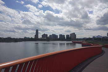 旅游业的开发是浦江县五水共治产业转型中极为重要的一环。为此,队员沿着浦阳江一路行至金狮湖。曾经的荒凉破败不再,虽仍在修建中,沿岸却是绿意盎然,被墨意气息点染:一桥一塔,楼近山远,云高水低,错落有致。湖面碧透,映出随风飘荡的云,微风一过,碧波荡漾。怀抱西子之含蓄,又近西施之温婉,可以预见修成之后的引人入胜。