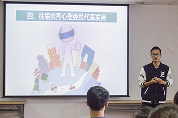 负责本学年心理工作兼职辅导员吕梦琪同学和上届兼职辅导员曹露露同学简要介绍学院心理工作和各类心理活动的开展情况,并表达了对心理委员团队“提升自身能力、关爱身边同学,传递正能量”的期待。