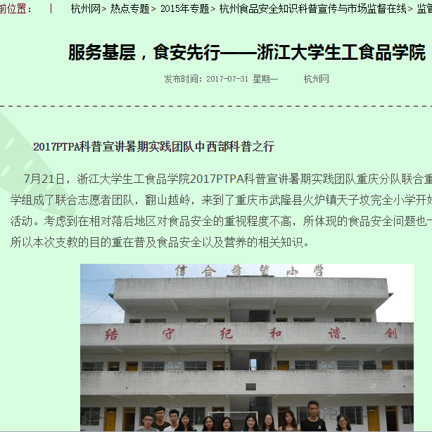 为充分发挥社会实践在加强和改进大学生思想政治教育中的重要作用,激发大学生为国家、社会和学校服务的热情,以优异的实践成果献礼学校120周年校庆和学院60周年院庆,迎接党的十九大胜利召开,2017年暑期,生工食品学院选派了5支示范队伍、133人开展暑期实践,赴浙江、重庆等省市开展社会实践。