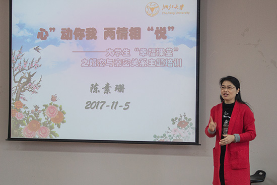 2017年11月5日上午,浙江大学“心动你我,两情相‘悦’”——大学生“幸福课堂”之婚恋与亲密关系主题团辅培训在农生环D422举行。学院原党委副书记、人事处副处长陈素珊老师受邀为全体学员带来一场寻找未知自己、感知亲密关系、树立正确婚恋观的心灵之旅。