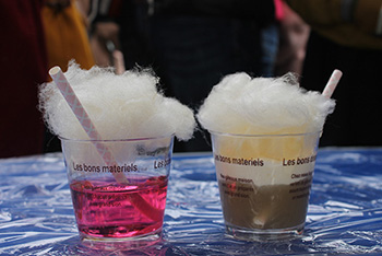 活动现场人影如织,彩旗飘飘,冬日暖阳中顶立的十多张蓝色帐篷映衬着主办方精心制作的美食节易拉宝展架让往来师生驻足赞叹。整个文化广场B区被分成四部分:中部设领票处用于发放“粮票”,同学们在该处领取心仪的粮票后可以赴其余帐篷兑换相应的美食;南面由食品科技协会承包,制作棉花糖饮料、雪梅娘和芋圆椰浆西米露;西边由美食社承包,制作草莓大福和酸辣凉皮;东边由烘焙社承包,制作椰丝糕、双皮奶、木糠杯和蛋白糖。此外还有浙江大学生工食品学院研究生创业团队calowee的友情加盟。面对如此种类繁多甜美可口的美食,同学们早已在各个帐篷前排起了长队,等待着美食的出炉。
