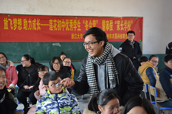 衢江莲花初中、龙游詹家小学是衢州市求是科技联合会的“求是课堂”公益活动的合作学校。衢州市求是科技联合会会长、浙江大学80级单建军校友带着热心校友全程陪同,单会长在两校的开营式上分别致辞,他动情地说,此次“冬令营”活动是联合会和浙大的在校生合作的成功硕果,是衢州市求是科技联合会“求是课堂”的系列活动之一,是浙大校友回馈地方、助力乡村发展的公益行动,是衢州浙大校友“情怀浙大 服务校友 助力衢州发展”理念的生动实践。