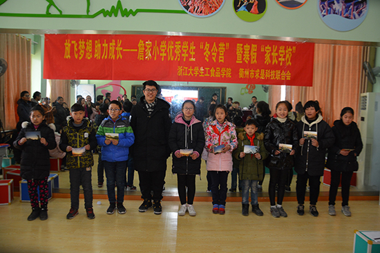 (衢州市求是科技联合会热心的浙大校友为冬令营的优秀学子颁奖)