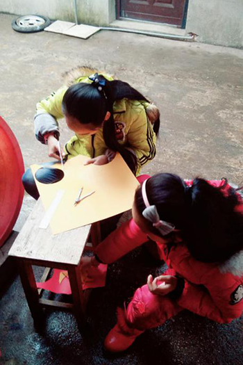 陪她们写完明信片之后,我再开始教她们做灯笼,培养她们的动手能力。我们一起先把彩纸剪出25个圆,然后用双面胶将圆粘起来,一个简单的元宵节花灯就完成了。她们两都忍不住再在灯笼上写上自己的心愿。制作过程虽然简单,但是我却能感受到她们心中的那难以隐藏的快乐。