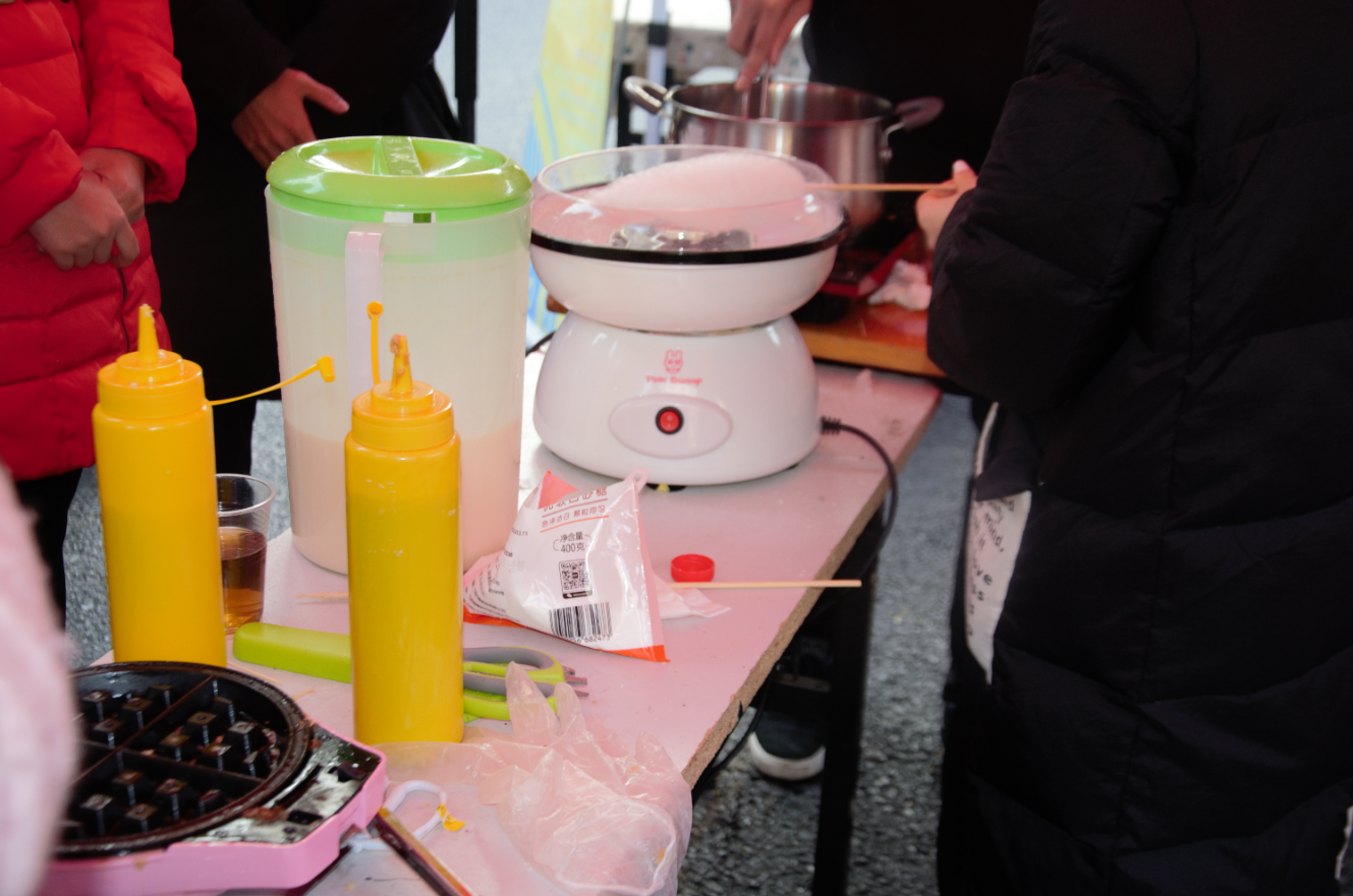 而另一边在丹青学园门口,几个社团的同学们也在忙碌的准备中。食科协的同学们乐此不疲地制作着棉花糖,港澳台协会的同学们则熟练地做着Q弹的地瓜球,调制着香醇可口的台式饮料,例如冬瓜鲜奶、红茶冬瓜鲜奶。而这些香喷喷的小点心和饮料都将成为参与游戏的同学们的礼品。除此之外,烘焙社也在现场制作华夫饼,香喷喷的华夫饼一出炉,就引得不少路过的同学闻香驻足,前来一探究竟。