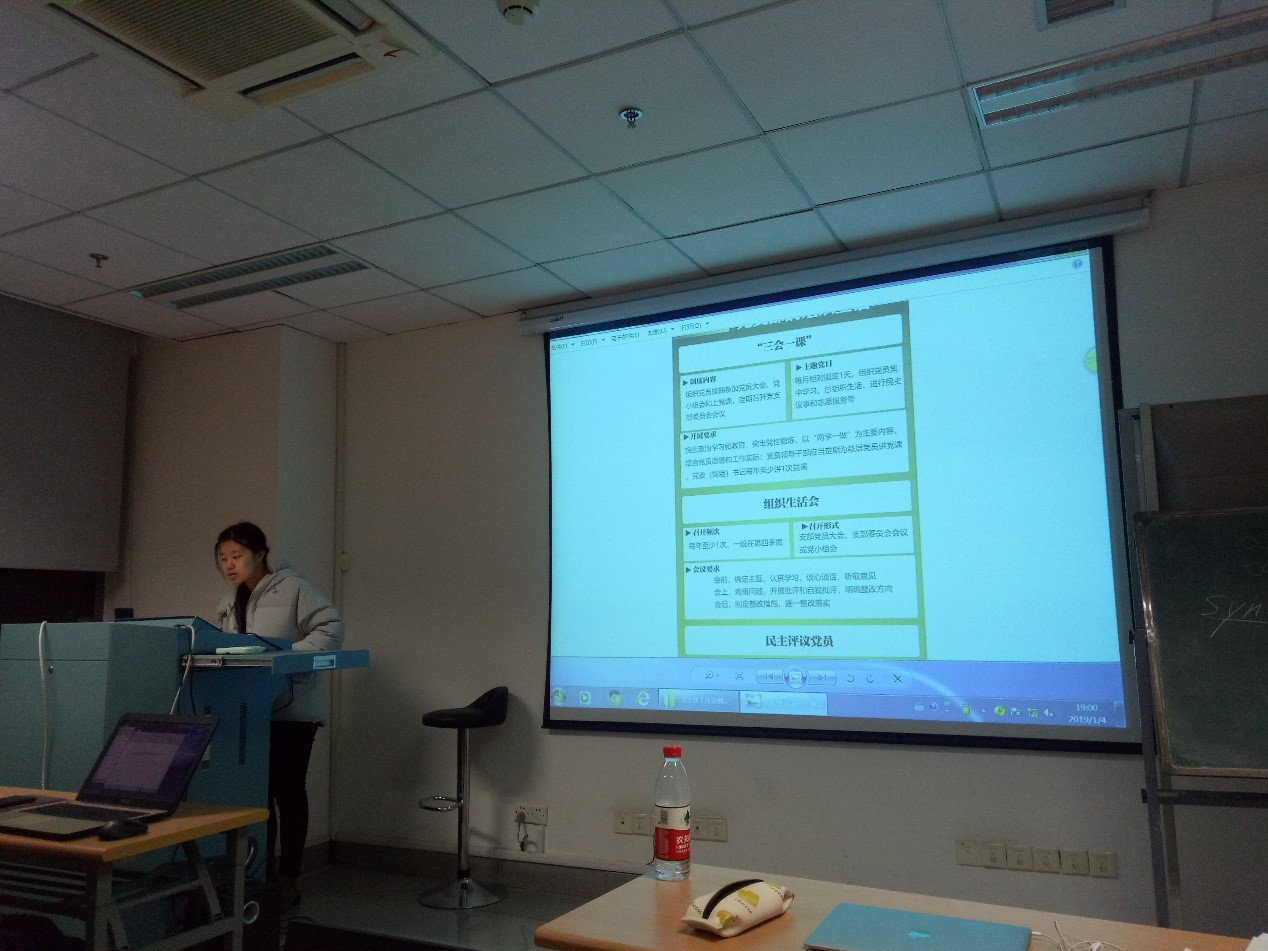 会议最后,刘姝妤同学向支部党员就即将召开的组织生活会具体内容和操作进行了解释,对谈心谈话、批评和自我反省、组织开展民主评议党员的具体要求进行讲解。