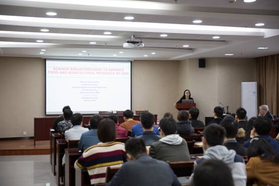 Norman R. Scott院士告诉大家正是因为具有如此多般的挑战,才鼓动着我们不断前进的脚步。在报告中,具体提出了四大任务说明“未来几十年,粮食和农业可能面临的最大挑战是什么?”、“可预见的最大的粮食和农业科学发展机会是什么?”、“存在哪些基本知识缺口限制了科学家利用机遇应对这些挑战的能力?”以及“应推进和支持哪些研究领域,以填补这些知识空白?”在场的师生们翘首认真聆听,时而频频点头,时而笑声一片。