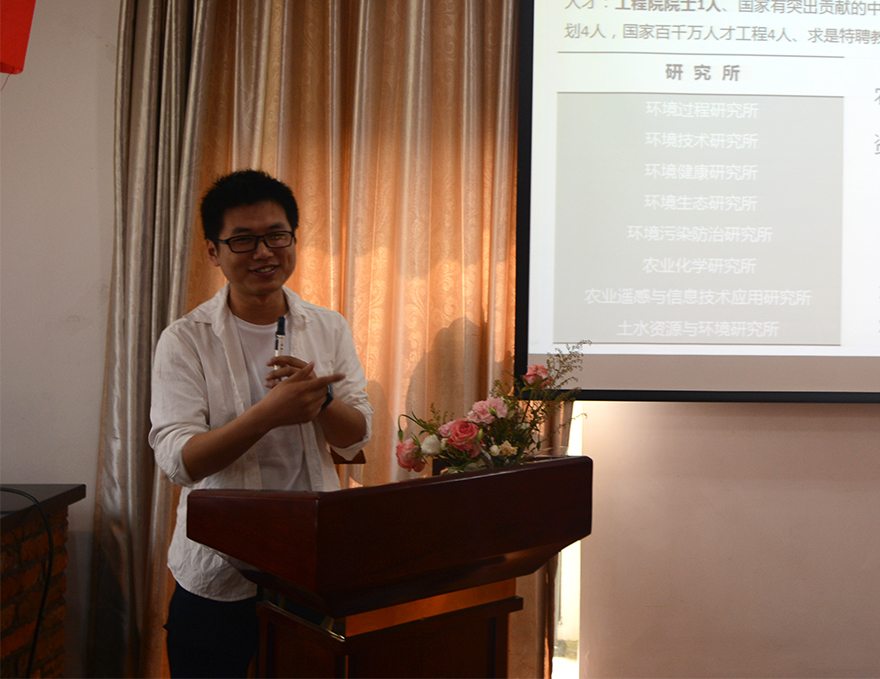 最后一位分享嘉宾是来自环资院的吕盘龙学长,曾发表3篇SCI,累积影响因子达16。吕盘龙学长从环资院的整体情况讲起,对自己所在的团队“膜生物反应器、重金属生物还原、废水深度处理”三大研究内容进行全面的介绍,并就自己的研究方向为大家作详细的讲解。此外,学长还提出在科研及日常生活中,应做到“专注科研,热爱生活”。