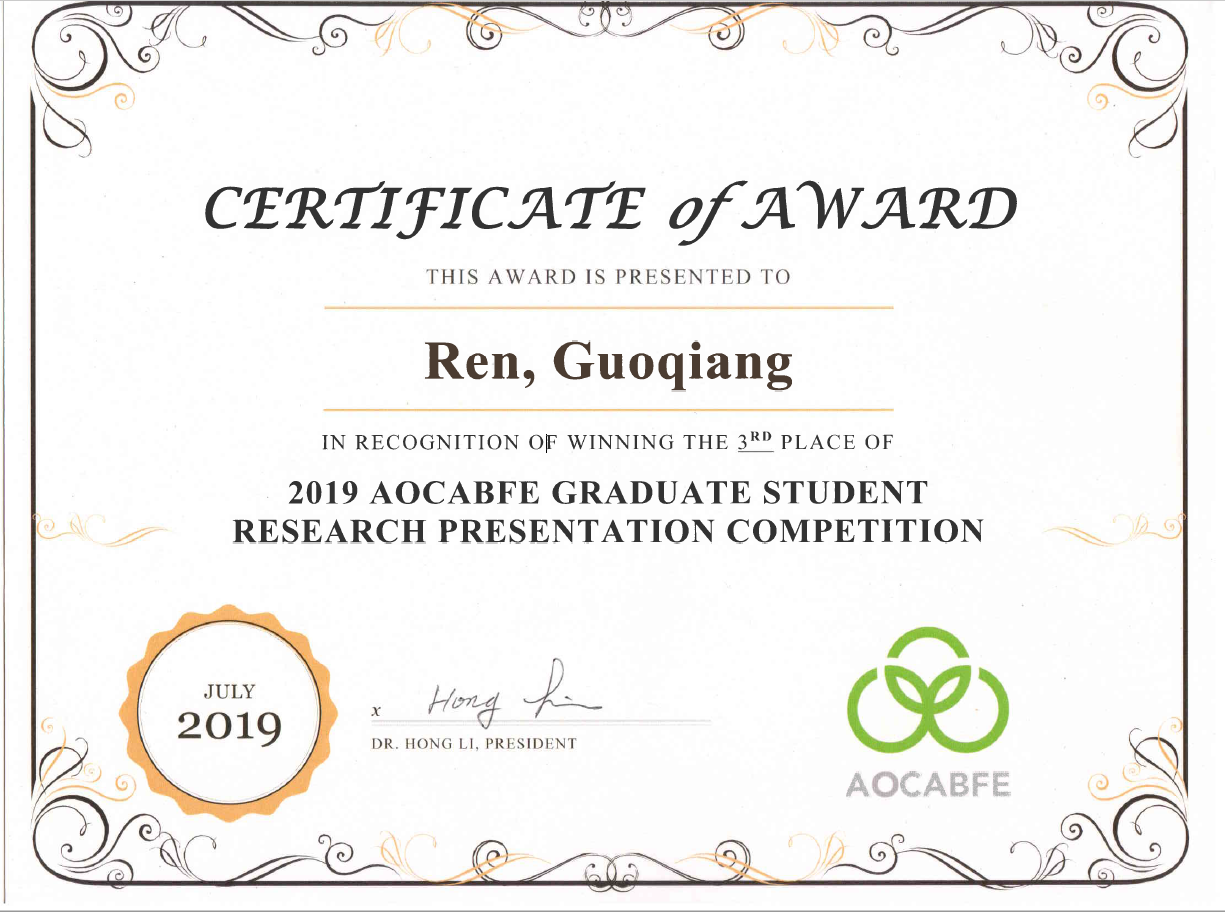 2019年7月7-10日在美国波士顿召开的2019美国农业与生物工程师学会(ASABE,American Society of Agricultural andBiological Engineers)国际学术年会上,bat365正版唯一官网生工系18级直博生任国强同学(导师:K.C. Ting教授,应义斌教授和林涛研究员)参加会议进行口头汇报,并以主题“MobileRobotics Platform for Whole-Poultry-House Approach to Compartmentalized EggProduction Management”参加2019Association of Overseas Chinese Agricultural Biological Food Engineers (AOC)Student Research Presentation Competition ,荣获研究生研究成果展示竞赛三等奖。