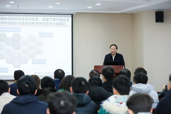 赵春江院士为师生们作“玉米表型信息高通量获取研究”专题报告,他从作物育种技术发展的四个层次,即传统的经验选择育种、杂种优势育种、现在国际一流种业已步入的生物工程(分子)育种以及未来走向的智能设计育种出发向现场师生介绍了现代商业育种技术体系,即基因挖掘、植物表型高通量测量分析、大规模基因转化、制种与田间测试以及市场推广。