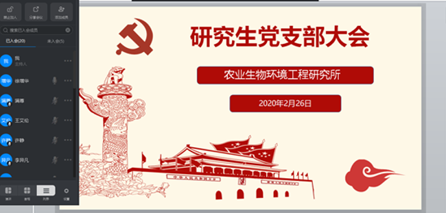 【序言】这是一个不平凡的春天,这是一个特殊的新学期。新型冠状肺炎病毒的席卷改变了每个人的生活节奏和社会步调,全民战“疫”已然打响。当前,疫情形势依然严峻复杂,防控正处在最吃劲的关键阶段。在疫情防控的关键时期,为学习贯彻好习近平总书记重要指示精神和党中央、教育部及学校关于疫情防控的工作部署,巩固“不忘初心、牢记使命”主题教育成果,明确“离校不离教、停课不停学”,生工食品学院各学生党支部积极响应号召,依托网络平台开展了线上党员大会。通过线上主题学习,强化广大学生党员在特殊时期的责任意识、担当意识、奉献意识,通过线上主题党日活动,密切学生党员的相互联系,增强战胜疫情的坚定信心和坚强决心,发挥好广大党员同志的先锋模范作用,以“咬定青山不放松”的韧劲、“不破楼兰终不还”的拼劲参与到战“疫”行动中,共同打赢全民疫情防控狙击战!今日推出生工系本科生党支部、农业生物环境工程研究所研究生党支部的组织生活剪影。