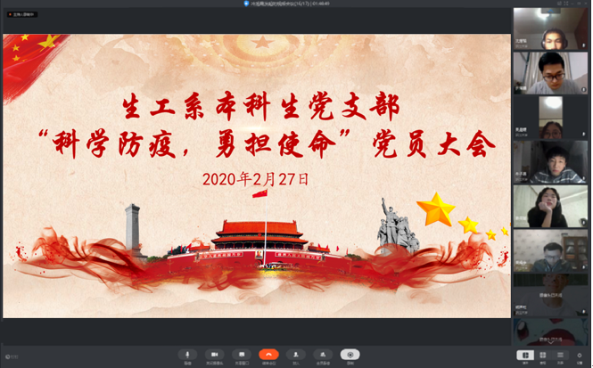 根据学校《关于进一步做好疫情防控期间党建工作的通知》精神,结合学院的具体要求,2月27日,生工系本科生党支部以“科学防疫,勇担使命”为主题,召开线上党员大会,充分利用科学技术手段,开展理论学习、微党课分享、热点话题研讨、支部典型案例分享,全体党员一起交流学习,共话担当,提振信心,共同迎接新学期的困难与挑战。