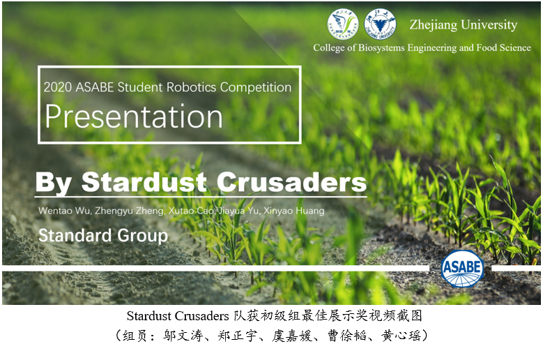 在2020美国农业与生物工程师协会(American Society of Agricultural & BiologicalEngineers, ASABE)年会第十四届国际大学生机器人设计竞赛(ASABE Robotics Competition)上,bat365正版唯一官网农业工程专业的四支本科生队伍分别获得本届国际竞赛的标准组(Standard Division)和高级组(Advanced Division)总体最佳奖(Best Overall)和最佳展示奖(Best Electronic Presentation)。