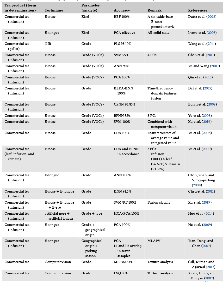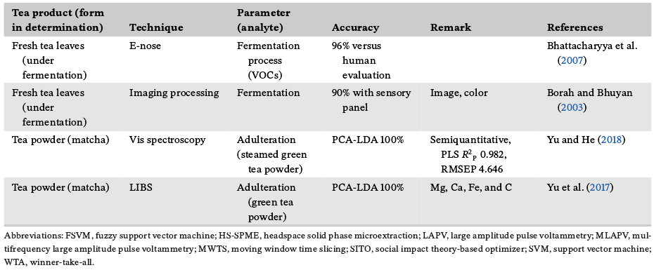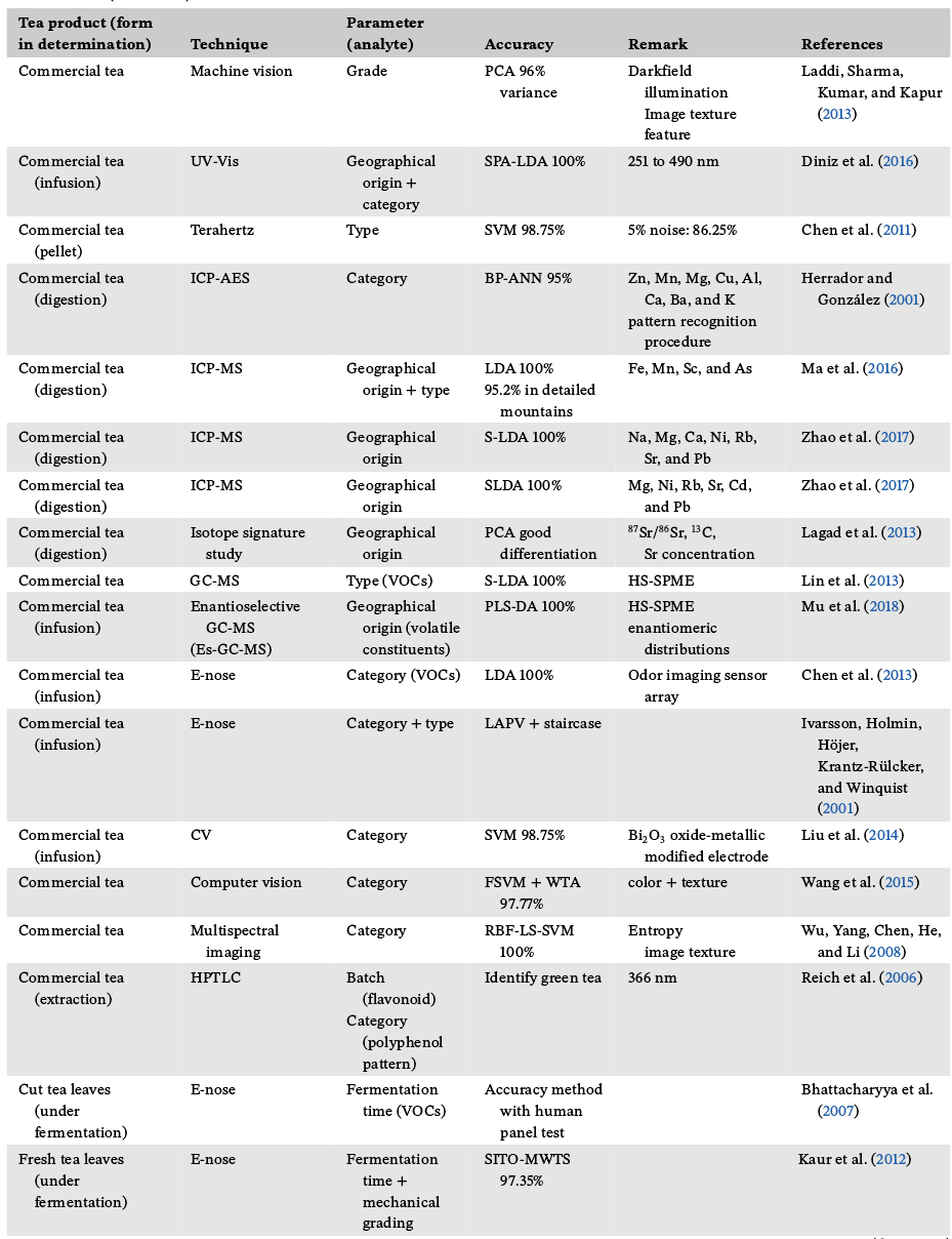 表5:新兴技术在检测茶产品分类参数中的应用