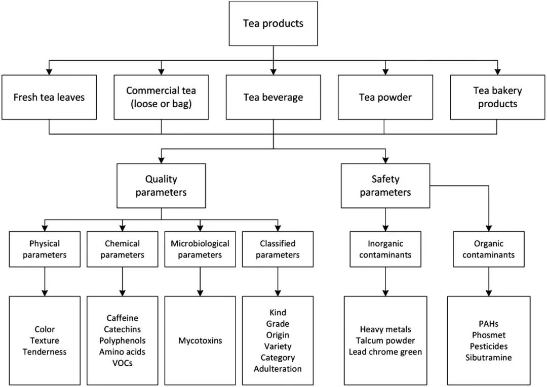 类似于其他食品,茶叶产品的质量和安全是茶叶产品的两个主要方面,包括物理参数(例如新鲜茶叶的颜色、质地和嫩度)、化学参数(例如儿茶素、挥发性有机化合物(VOCs))、分类参数(例如等级、产地来源、品种和类别)、无机污染物(例如铅铬绿)和有机污染物(例如西布曲明)。目前,大部分参数都有标准检测方法,然而这些方法费时费力且需要操作技能,特别是茶的感官品评需要专业人员来进行。这些局限性促使研究人员聚焦新技术,从而开发出能够快速、高效且当场检测茶产品质量和安全的方法。