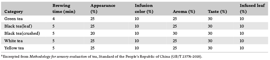 表3:绿茶、红茶、白茶和黄茶冲泡时间和五项指标比例