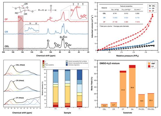 针对上述难题,该研究报道了一种从纤维素高效转化合成HMF的方法,该研究采用绿色可回收的甲酸对纤维素进行化学改性实现纤维素功能化,考察了甲酸改性处理对纤维素的化学成分与结构特性的影响,揭示了甲酸处理过程中纤维素大分子的演化机制;利用Lewis-Brønstedacid组合催化剂对甲酰化纤维素(celluloseformate,CF)于DMSO-H2O共溶剂体系中进行催化转化合成HMF,通过分子动力学模拟阐述了纤维素甲酰化修饰与DMSO溶剂的特定作用机理,构建了HMF的高选择性催化反应体系。