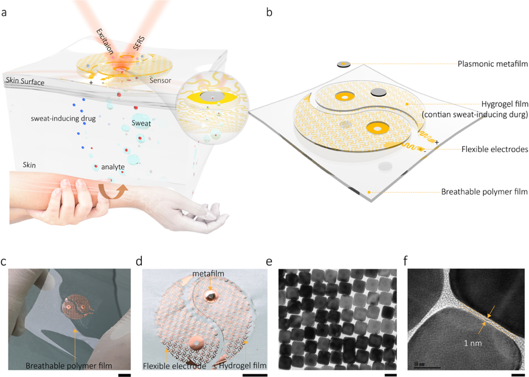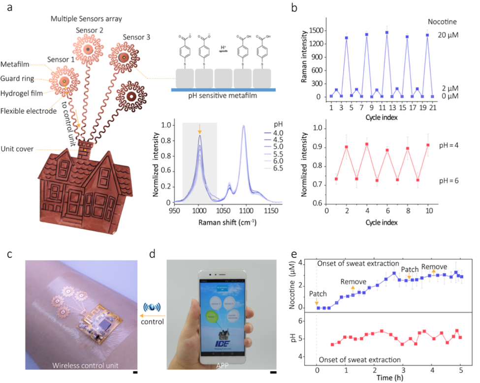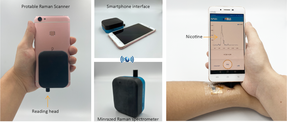 针对上述难题,该研究团队首次将具备单分子检测能力的表面增强拉曼散射(SERS)作为柔性传感器的底层传感原理,解决柔性超材料纳米结构各种变形下保持SERS活性的技术难题,结合无创样品提取技术,成功实现了体内微量化合物的实时动态检测,为评估生物体健康状态提供了一种通用、灵敏的分子跟踪手段。针对可穿戴式传感器特殊的应用场景,该研究团队还研发了便携式拉曼光谱扫描设备“Ramanscanner”。