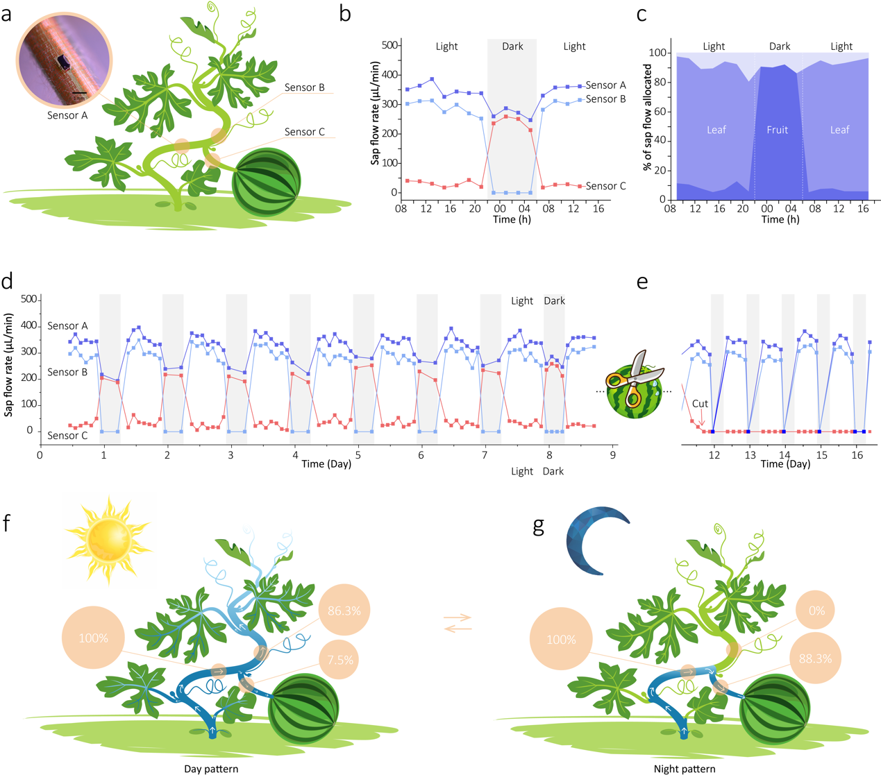西瓜果实绝大部份是水(95%左右),然而茎流传感器测量发现:在白天只有极少部分水被运输入果实用于生长(5%),绝大部份水被叶片蒸腾作用消耗掉;但是到了夜间,几乎所有的水分都被运输到果实,绝对茎流量相对日间增加了10倍。