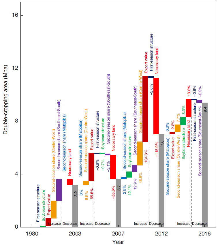本研究量化分析了巴西大豆玉米复种指数的空间分布及其时间动态变化情况。通过从单季大豆到大豆-玉米双季种植的转型,巴西的大豆-玉米的平均复种指数到2016年已增至1.25。在三大主产区,中西部的复种指数最高(1.43),南部紧随其后(1.32),马托皮巴最低(图3)。研究通过归因分析发现全球对大豆和玉米的需求增加促进了巴西农业生产端的集约化进程(图4)。通过大豆品种改良和机械化采收播种等手段,巴西实现了不同区域的双季种植。该体系不仅更充分地利用了自然资源,也提高了对加工、储存和运输等基础设施的利用效率。