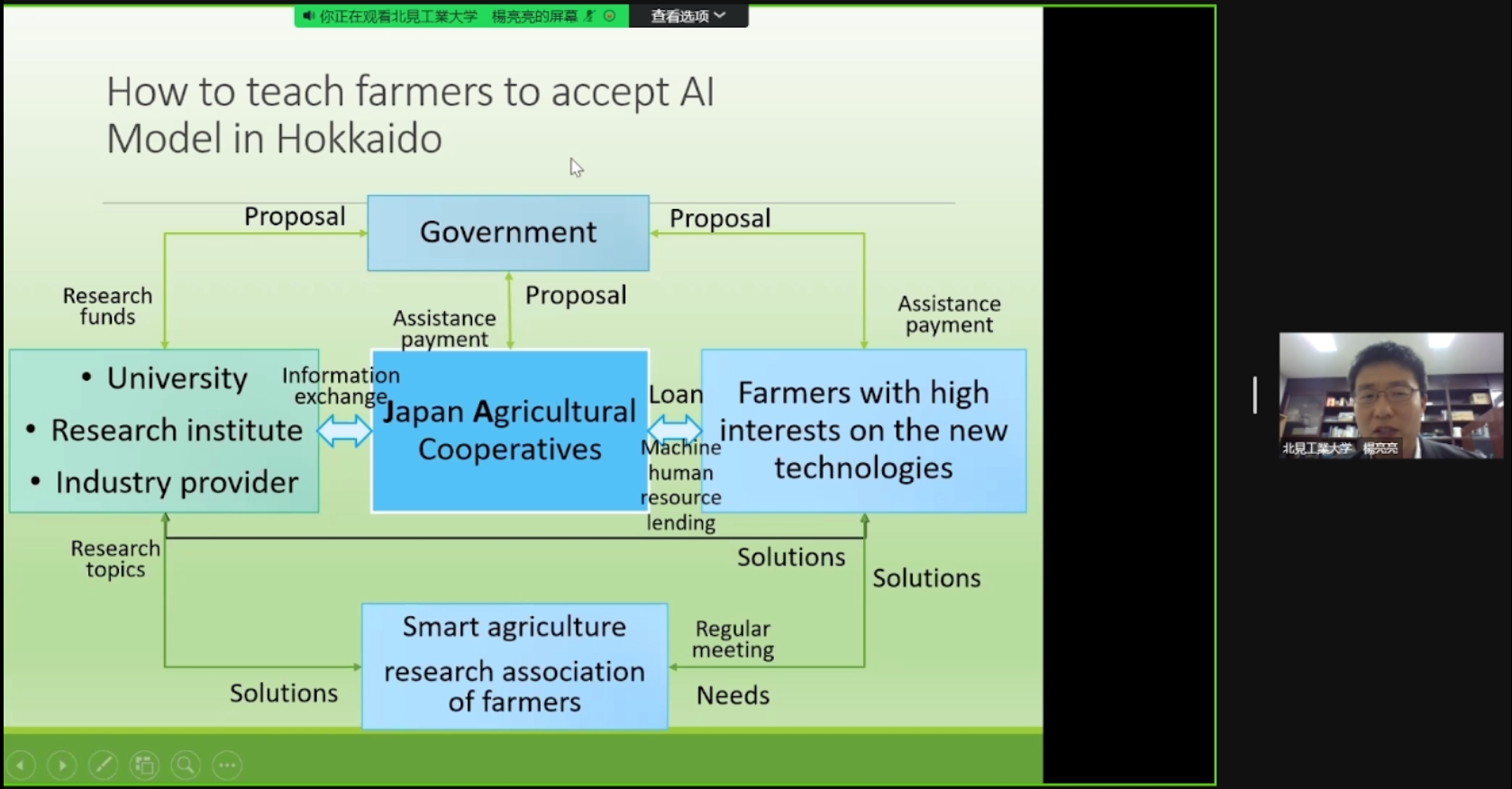 Afterward, Dr. Yang presented the sketchmap about how to teach farmers to accept the AI model in Hokkaido. Heintroduced his researches according to projects in which he's involved. The mainpoints are to explain robot tractors and Quasi Zenith Satellite System (QZAA). Controlmethods, headland turning methods, position compensation of robot tractors usedfor cultivation, seeding, fertilization, weeding, spraying, and harvesting,were showed in the report. QZAA with a limited coverage area is mainly appliedto supplement and enhance the signals of GPS. We could see the operations ofthe robot more intuitively from videos provided by Dr. Yang.