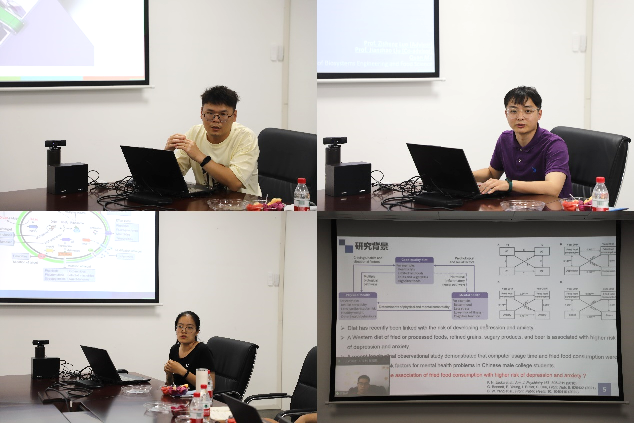 边永亮同学针对泡核桃设计了一种小型智能核桃坚果品质检测+精准开壳平台,预期实现自动化、精准和高效的泡核桃开壳操作,减少人工操作的依赖,降低劳动成本。马全同学作《NAD capped RNA in plant - An uncharted territory of RNA epitranscriptional regulation》的报告,此研究着重于解决NAD帽在植物物种中的重要生物学作用以及它对草莓成熟的表观转录调控作用。于婷同学介绍了一种基于纳米金列阵和机器学习算法的ESKAPE细菌耐药性检测方法,与抗生素敏感性试验结果相比,该方法能在20分钟完成耐药性的鉴定,准确率为89.74%,具有临床应用前景。汪安利同学介绍了油炸食品引发焦虑和抑郁风险的健康危害的研究,此研究深度诠释了习惯性油炸食品消费增加焦虑和抑郁风险的重要发现。