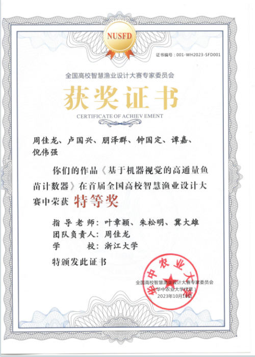 刘鹰和叶章颖教授指导学生荣获首届高校智慧渔业设计大赛特等奖