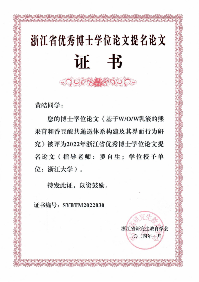2022年浙江省优秀博士学位论文提名论文:《基于W/O/W乳液的熊果苷和香豆酸共递送体系构建及其界面行为研究》
