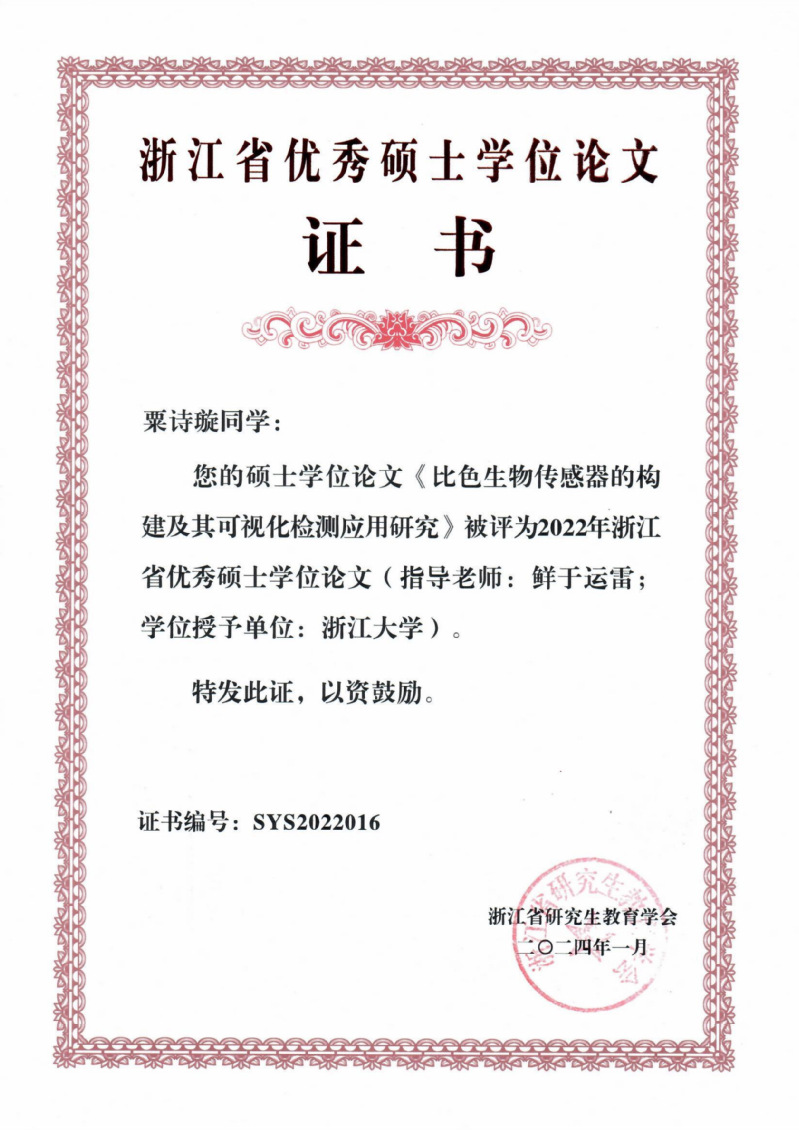 2022年浙江省优秀硕士学位论文《比色生物传感器的构建及其可视化检测应用研究》