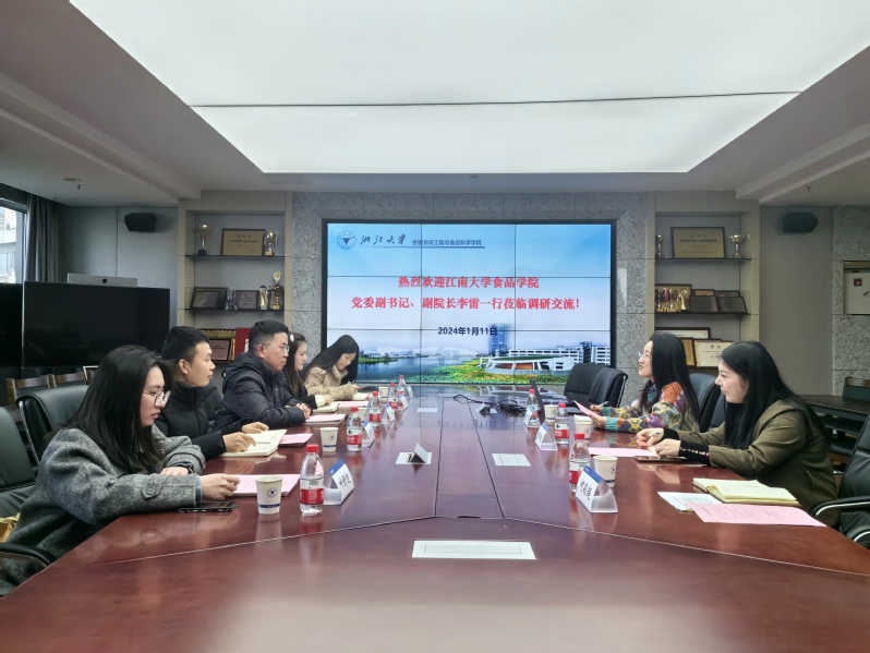 2024年1月11日,江南大学食品学院党委副书记、副院长李雷一行来学院交流。学院党委副书记、纪委书记王一清、团委书记梅玫、博士生专聘兼职辅导员何颖超参加会议,会议由王一清主持。