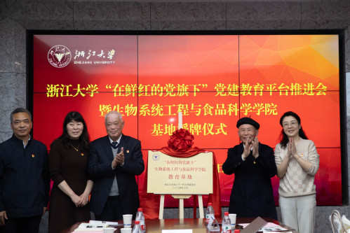 在热烈的掌声中,邹先定、王明华、朱征、李金林、张川霞共同为“在鲜红的党旗下”生物系统工程与食品科学学院教育基地揭牌。