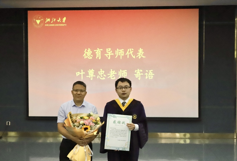 毕业班学生代表为毕业班班主任代表、毕业班德育导师代表送上感谢状并献花。毕业班班主任、德育导师代表李莉寄语毕业生要保持初心,母校永远是大家坚实的后盾。毕业班班主任鲜于运雷寄语毕业生要保持乐观的心态,并且祝福毕业生前程似锦。德育导师代表杨暄寄语毕业生要秉持求是创新精神,保持对知识的渴望和好奇。德育导师代表叶尊忠寄语毕业生要内心强大,无惧前行道路上的风雨,为祖国现代化建设添砖加瓦。