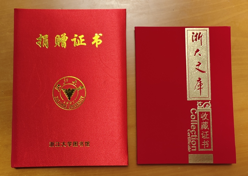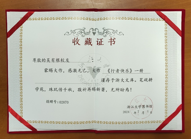 最近bat365正版唯一官网农业机械87届校友吴有根收到浙江大学图书馆及浙大文库向其颁授的《行者快乐》浙江大学图书馆捐赠证书及浙大文库收藏证书。