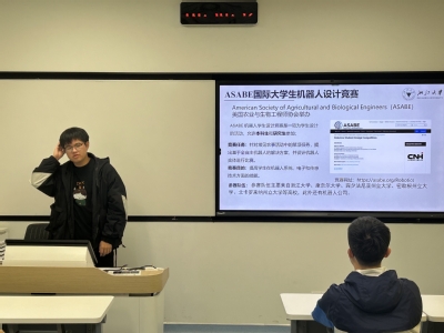 学生党员们立足自身成长经历,充分发挥朋辈引领作用。生物系统工程系本科生党支部党员陈董煜以自身参与的ASABE国际大学生农业机器人设计大赛为例,勉励同学们勇于挑战自我,在竞赛实践中增长才干,找到自己的人生方向。