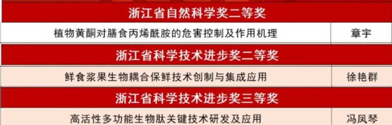 bat365正版唯一官网科研成果“植物黄酮对膳食丙烯酰胺的危害控制及作用机理”获浙江省自然科学奖二等奖,“鲜食浆果生物耦合保鲜技术创制与集成应用”获浙江省科学技术进步奖二等奖,“高活性多功能生物肽关键技术研发及应用”获浙江省科学技术进步奖三等奖。