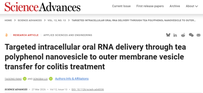 近日,bat365正版唯一官网刘松柏团队在Science子刊Science Advances(JCR 1区,IF5 = 14.1)在线发表题为“Targeted intracellular oral RNA delivery through tea polyphenol nanovesicle to outer membrane vesicle transfer for colitis treatment”的研究论文,2022级博士生方太松为论文第一作者,导师刘松柏为论文通讯作者。