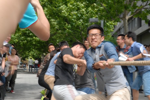 首先开展的是激动人心的拔河比赛,杭城当天32℃的高温也丝毫不能掩盖各位参赛者的热情。学院老师组成的“男神女神队”和学院学生组成的“小鲜肉队”早已按捺不住内心的激动,现场火药味十足。随着裁判一声令下,双方开始奋力拼搏。而比赛的形势似乎从一开始就呈现出一边倒的态势,“小鲜肉队”很快败下阵来,教师代表队赢得了拔河比赛。整齐嘹亮口号和一致的步伐是“男神女神队”获胜的关键因素,而其背后岁月的积淀和成熟的心态或许是更加深层次的原因。而失败的学生代表队也并没有露出失败者惯有的颓势,反而是笑对事实。失败的正确面对方法是坦然,只有这样的失败才能称为成功的铺垫,而我们的同学们似乎早已洞穿一切,相信他们亦从中收获颇丰。