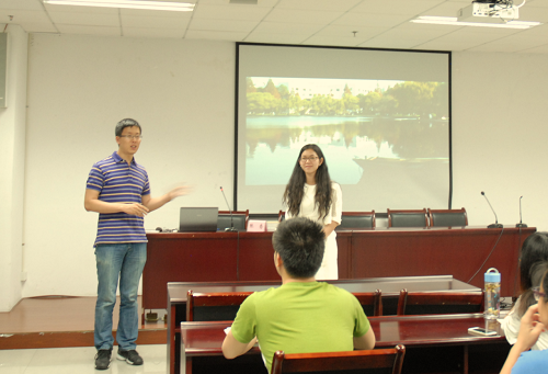 图1学院团委副书记夏平(左)介绍主讲老师――张鸯(右)