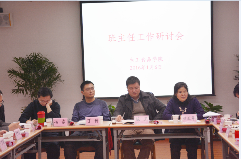 2016年1月6日,生工食品学院期末班主任工作研讨会在农生环组团D422教工之家举行。学院党委书记楼锡锦、副院长蒋焕煜出席,全体班主任老师以及学院本科教学科、云峰学园辅导员、学院本科生辅导员参加。会议由学院党委副书记陈素珊主持。