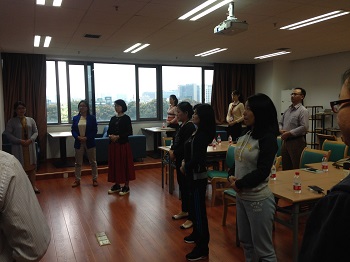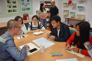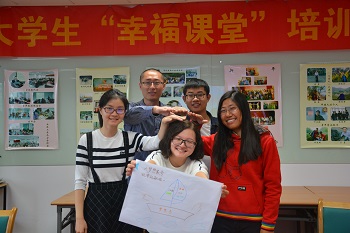 活动的第二个部分是对我们学生的幸福训练课。何老师通过有趣的分组互动方式,大家从互动式的自我介绍到一起组织队名,一起给团队设计Logo大家越来越放开了。15日上午, 以“公开自我”、“隐藏自我”、“盲目自我”和“潜在自我”四个方面为线索,引发大家对“我是谁?”这样的哲学问题的深入思考和讨论,同学们展示了角度多样的答案,收获颇丰。