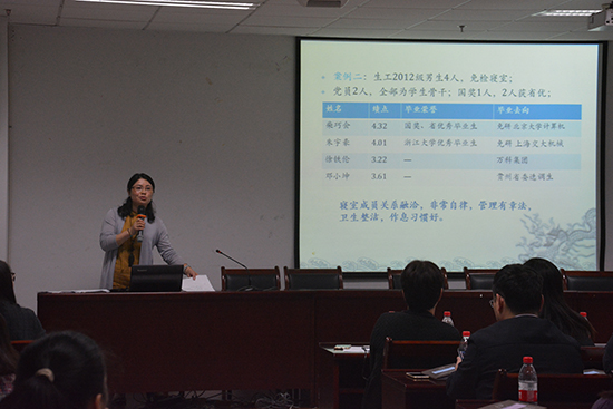 郑晓冬老师作为2015级的优秀新生之友给新一届的新生之友分享了她独到的经验。第一点是要让学生抵御其他的干扰,帮助学生做好角色的转变,这也是学校设立新生之友的初衷。要增加和学生的接触,帮助同学快速适应大学的生活。第二点是关注学生的全面发展。第三点是帮助学生制定学习计划和人生的规划。最后她表示,作为新生之友的同时,自身也收获了很多。